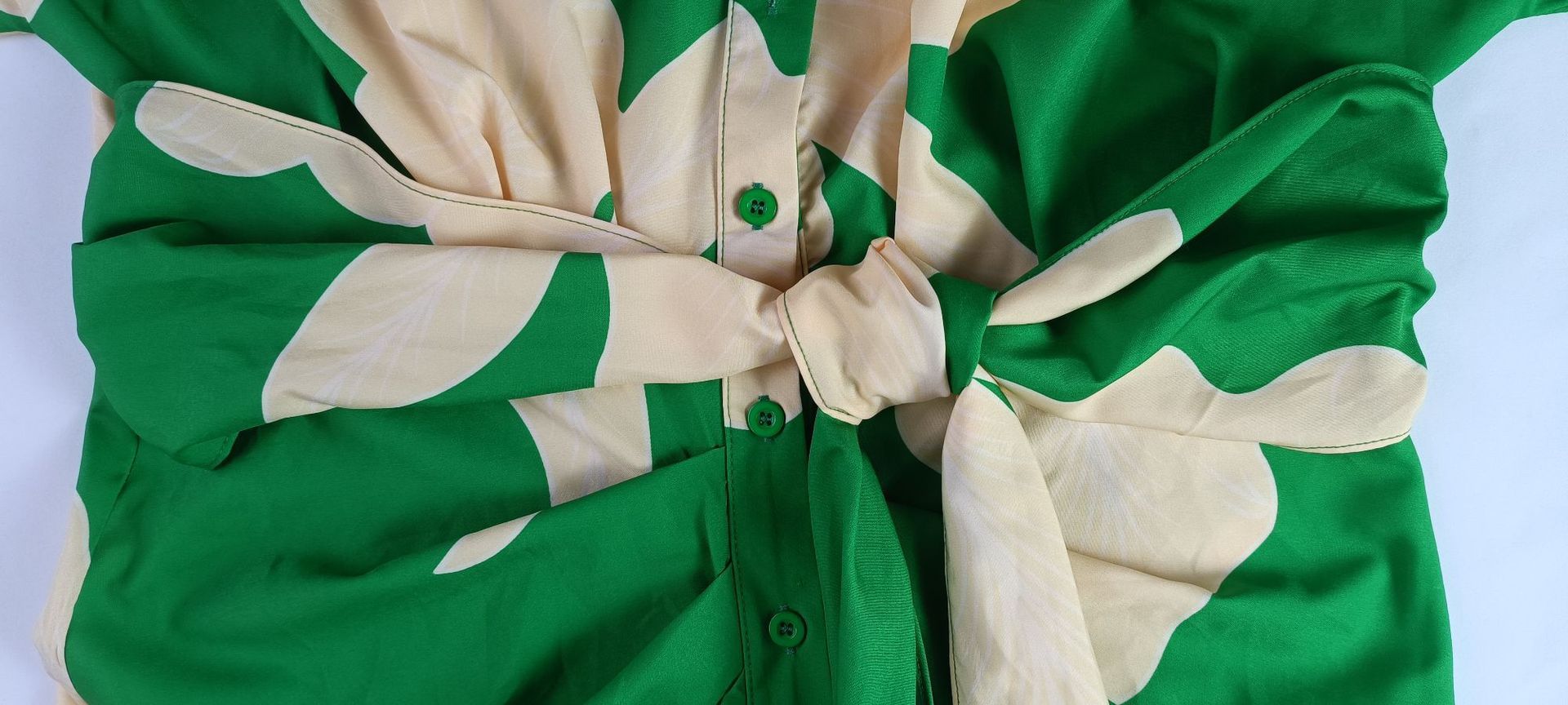 La ceinture assortie souligne joliment la taille, créant une silhouette féminine et harmonieuse. Elle permet également d’ajuster la robe selon vos préférences, pour un style tantôt structuré, tantôt plus décontracté. Ce détail ajoute une note de charme supplémentaire et met en valeur la coupe fluide du vêtement.